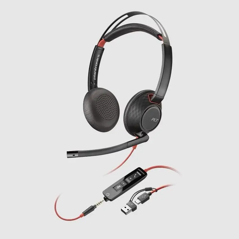 La serie Blackwire 5200 se adapta a tu ajetreada jornada laboral. Fácil de usar, su conectividad USB o USB-C y de 3,5 mm te permite trabajar con una variedad de dispositivos. Con un diseño ergonómico, es lo suficientemente cómodo como para usarlo todo el día, incluso en tus llamadas más largas. La serie Blackwire 5200: el poder de conectarte y trabajar fácilmente ya está aquí. Sus suaves orejeras proporcionan cancelación pasiva de ruido, al mismo tiempo que un micrófono sintonizado con precisión bloquea el ruido cercano. Tus oídos te lo agradecerán, especialmente después de largas conferencias telefónicas. Cable USB-C con adaptador USB-A para obtener conectividad a PC y de 3,5 mm para teléfono celular o tablet. Tus configuraciones, tu manera: Personaliza tus auriculares con Plantronics Hub para computadoras de escritorio.