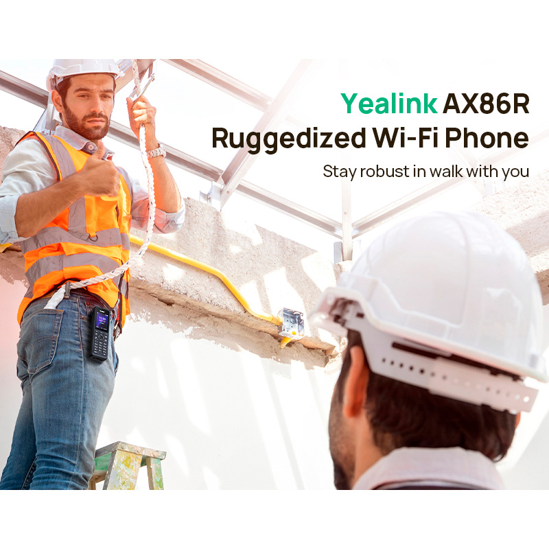 El AX86R es un teléfono empresarial portátil Wi-Fi IP con pantalla en color que satisface las necesidades de comunicación inalámbrica. El AX86R cumple la norma de protección IP67, por lo que es resistente al agua, al polvo y a caídas desde 1,8 metros. El AX86R admite el registro de hasta 4 cuentas SIP, conferencias locales de 5 vías y cuenta con una pantalla en color de 2,4 pulgadas. Integra la tecnología Optima HD Audio y Smart Noise Cancellation de Yealink para ofrecer una calidad de audio excepcional y una comunicación de voz clara. Está equipado con un módulo Bluetooth 5.0 integrado y un módulo Wi-Fi 6 de doble banda 2.4G/5G, combinados con una avanzada tecnología de itinerancia sin fisuras, lo que le permite mantenerse a la vanguardia en la era inalámbrica en constante evolución. Además, AX86R está equipado con una batería de 3100mAh, proporcionando un tiempo de conversación de 13 horas y un tiempo de espera de 300 horas. Se utiliza ampliamente en diversos escenarios inalámbricos como la atención médica, la fabricación, los almacenes, el transporte y la educación.